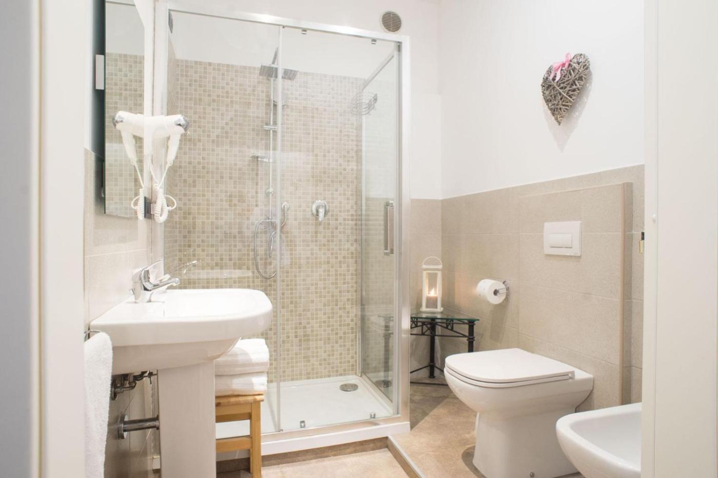 Camera Tripla Comfort con Doccia. The spacious triple room provides air conditioning, a tea and coffee maker, as well as a private bathroom featuring a shower and a bidet. The triple room offers a wardrobe, a tiled floor, heating, a flat-screen TV, as well as city views. The unit offers 2 beds. ;