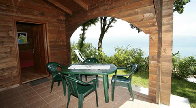 Chalet con 2 Camere da Letto. Casa vacanze in stile rustico, dotata di soffitti con travi in legno a vista, patio con vista lago, grande cucina con tavolo da pranzo e bagno privato con doccia. È riscaldata con una stufa a pellet. ;