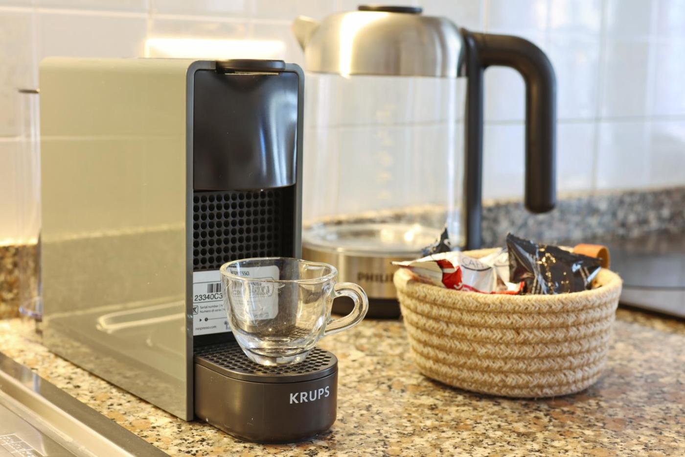 Questo appartamento con aria condizionata comprende 2 camere da letto e 1 bagno con bidet, doccia edi cortesia. La cucina dispone di frigorifero, forno e microonde, più macchina da caffè e bollitore elettrico.